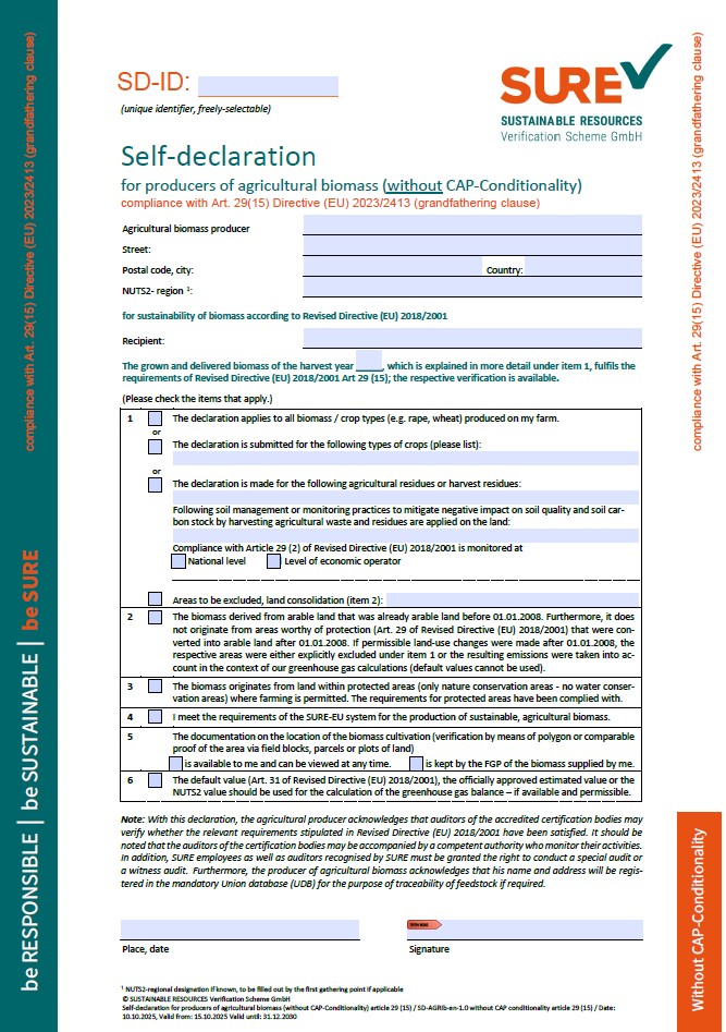 | Selbsterklärung für landwirtschaftliche Erzeugerbetriebe (ohne GAP Konditionalität) - Einhaltung von Art.29 Abs.15 der Richtlinie (EU) 2023/2413 (Bestandschutzklausel) (Version 1.0, gültig ab 15.10.2025, gültig bis 31.12.2030) | Englische Version Deutsche Version Polnische Version | Spanische Version Tschechische Version Slowakische Version | |