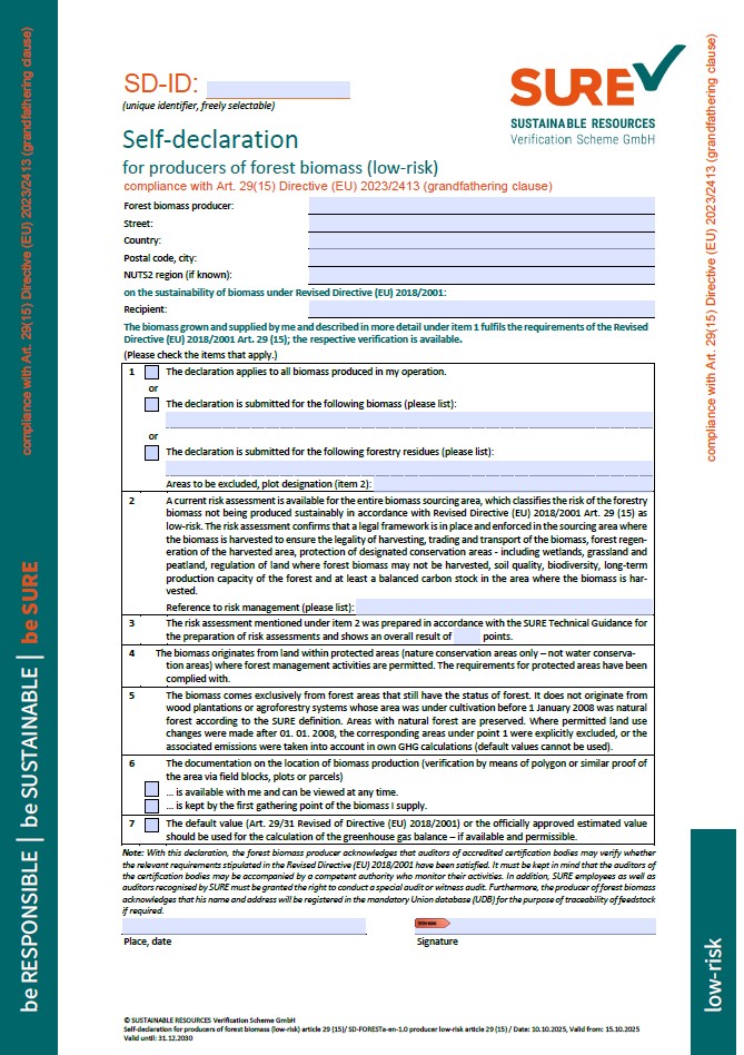 | Selbsterklärung für forstwirtschaftliche Erzeugerbeitriebe (low-risk) - Einhaltung von Art.29 Abs.15 der Richtlinie (EU) 2023/2413 (Bestandschutzklausel) (Version 1.0, gültig ab 15.10.2025, gültig bis 31.12.2030) | Englische Version Deutsche Version Polnische Version | Spanische Version Tschechische Version Slowakische Version | |