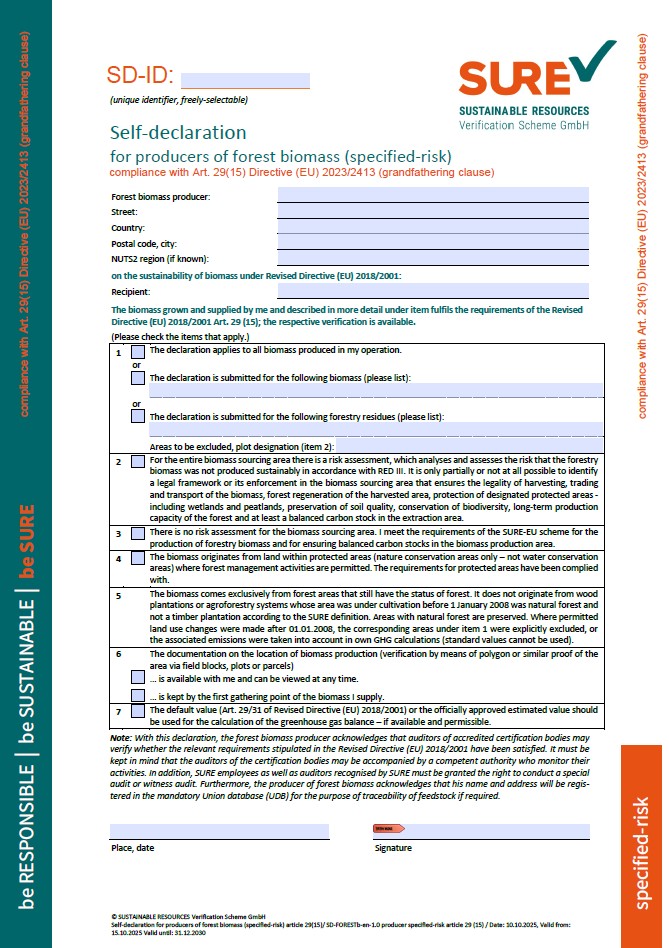 | Selbsterklärung für forstwirtschaftliche Erzeugerbetriebe (specified-risk) - Einhaltung von Art.29 Abs.15 der Richtlinie (EU) 2023/2413 (Bestandschutzklausel) (Version 1.0, gültig ab 15.10.2025, gültig bis 31.12.2030) | Englische Version Deutsche Version Polnische Version | Spanische Version Tschechische Version Slowakische Version | |